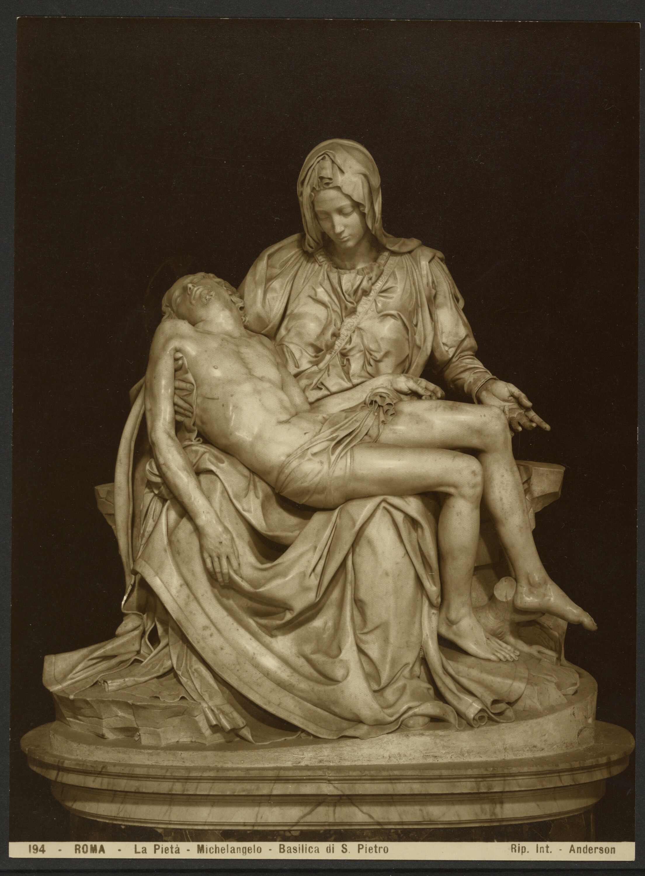 미켈란젤로는 피렌체와 가까운 지역 카프레제에서 태어났다. 그는 13살이 되었을 때 기를란다요의 제자로 들어가게 되었는데 곧 이후 로렌초 디 메디치의 눈에 들어와 그의 수양아들이 된다. 이때부터 그는 메디치가에서 소유한 많은 고대 조각들을 접하고 배울 수 있게 되었다. 1494년에 미켈란젤로는 피렌체를 떠나서 볼로냐에서 조금 머물고 이후 로마에서 살다가 다시 피렌체로 되돌아갔다. 이 시기에 유명한 <피에타>(1499)와 <다비드>(1501-1504)를 만들었다. 바티칸 베드로 대성당에 놓인 피에타는 예수를 무릎에 놓고 앉아 잇는 성모 마리아상이다. 대리석으로 제작되었는데 마리아의 옷주름에서 발견되는 섬세함은 타의 추종을 불허할 정도로 매우 사실적이다. 예수가 십자가에서 내려진 후 그의 어머니에게 안겨 있는 순간을 표현한 것인데, 축 늘어진 예수의 근육은 매우 사실적이게 묘사되었다. 시체 해부를 통해 터득한 신체의 특징들을 참고하여 예수의 늘어진 자세를 표현하였다. 전체적으로 큰 삼각형의 구도를 이루고 있어서 안정감을 주며 마리아의 치마폭을 이용하여 삼각형을 완성하고 있다. 미켈란젤로는 조각가의 역할이 돌에서 아름다움을 끄집어내는 것이라고 생각했다. 대리석 안에 갇혀 있는 인물을 해방하는 것이 자신의 역할이라고 보았다. 그렇기에 미켈란젤로는 한 덩어리의 돌만 조각하여 작품을 만들었다. 그는 생전에 자신의 작품에 서명을 남기지 않았는데 유일하게 <피에타>에만 자신의 서명을 새겨놓았다. 성모 마리아의 가슴을 가로지르는 띠에 서명을 새겨 넣었는데 자신의 이 걸작품이 흡족했던 모양이다.
